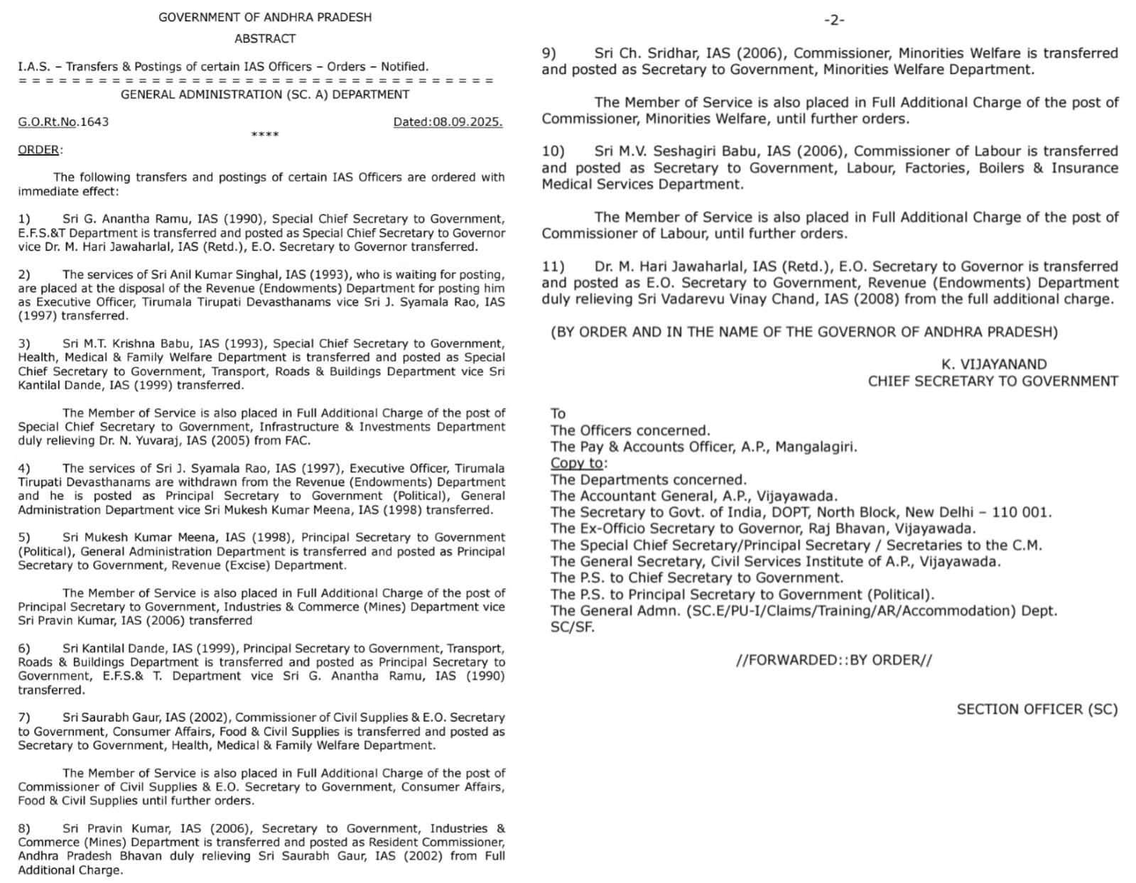 ఏపిలో పలువురు సీనియర్ ఐఏఎస్ అధికారుల బదిలీలు ▪️టీటీడీ ఈవోగా అనిల్ కుమార్ సింఘాల్. ▪️ఆర్ అండ్ బీ ప్రత్యేక ప్రధాన కార్యదర్శిగా కృష్ణబాబు.▪️మెడికల్ అండ్ హెల్త్ ప్రిన్సిపాల్ సెక్రటరీగా సౌరభ్ గౌర్. ▪️సాధారణ పరిపాలన శాఖ ముఖ్య కార్యదర్శిగా శ్యామలారావు.▪️ఎక్సైజ్, మైనింగ్ శాఖ ముఖ్య కార్యదర్శిగా ముకేష్ కుమార్ మీనా.▪️అటవీ, పర్యావరణ శాఖ కార్యదర్శిగా కాంతిలాల్ దండే. ▪️గవర్నర్ ప్రత్యేక ప్రధాన కార్యదర్శిగా అనంతరామ్. ▪️మైనారిటీ సంక్షేమ శాఖ కార్యదర్శిగా సీహెచ్ శ్రీధర్.▪️ ఎండోమెంట్స్ కార్యదర్శిగా … Read more